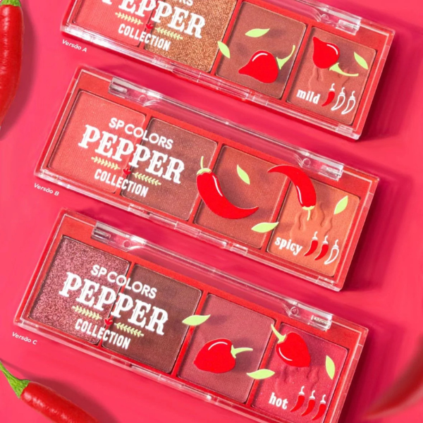 Pepper é a linha que mistura ousadia, intensidade e potência e foi inspirada na estética e variedade das pimentas que traduzem o que a linha Pepper é e carrega. Todos os produtos têm versões que variam as cores e embalagens de acordo com a intensidade das pimentas (fraco, médio e forte), o que tornou a linha bem temática e conceitual! Vale lembrar que os produtos da linha não possuem pimenta em sua composição! A linha conta com quartetos de sombra com embalagens pequenas e super levinhas para carregar por ai, que são muito práticas e com cores que combinam muito bem entre si. São sombras com tons fortes e intensos e que assim como as pimentas, predominam cores avermelhadas, amarronzadas e puxadas para o vinho, que vieram para entregar muita pigmentação e alta performance no esfumado, para que você possa criar maquiagens incríveis e ousadas! Tudo para deixar sua experiência com a Pepper mais real e intensa! E ai? Qual pimenta você vai encarar? Fraca, média ou forte?